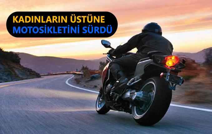 Kaldırımdaki tesettürlü kadınların üzerine motosiklet sürdü.
