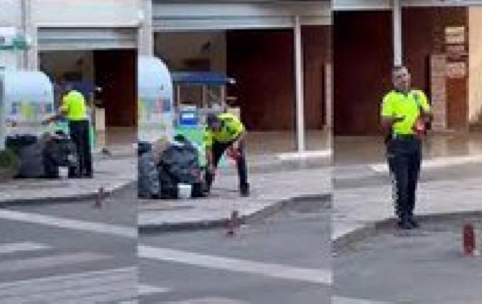 Trafik polisinden örnek davranış. Bayrağı çöpten çıkarıp temizledi.
